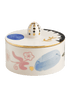 Ceramic Gunia sugar bowl with lid and golden round handle. The blue flower motif is hand painted and inspired by Ukrainian naive drawings. Perfect for special occasions and everyday use. Made from porcelain.