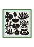 SILHOUETTES headscarf with a green trim. The elements of designer print originate from the 18th-20th centuries embroidered rushnyky from the Naddniprianshchyna, Kyiv, and Sumy regions, as well as Cossack elite embroidery from the 17th to 18th centuries. The oak tree leaf encapsulates the symbolism of this tree, which signifies might and wisdom in Ukrainian tradition. The stylistics of the imagery is inspired by vytynannia — the art form of paper openwork.