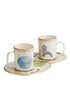 Sada dvou ručně malovaných šálků s podšálky Gunia. Modro růžové motivy jsou inspirované Ukrajinskými naivními kresbami. Ideální na čaj nebo kávu, pro každodenní použití nebo speciální příležitosti. Vyrobeno z porcelánu.